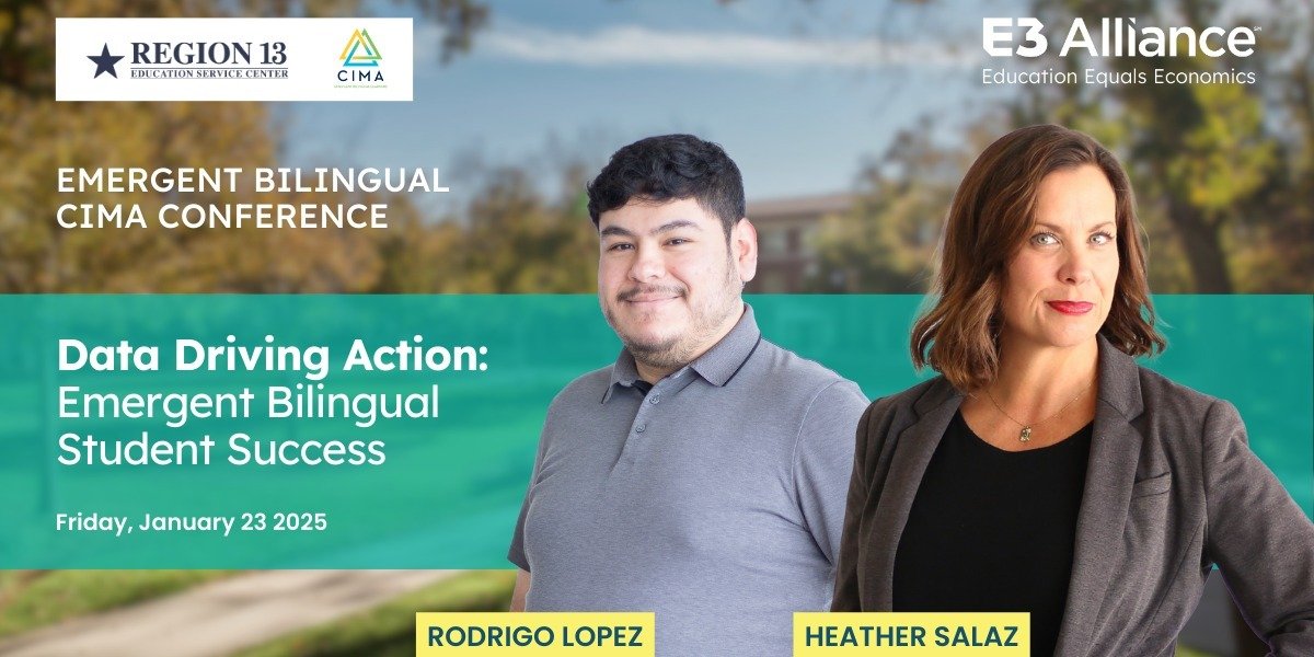 Wednesday, January 21, 2025 - Austin, Texas – Education Service Center Region 13 Conference on Instruction for Multilingual Advancement (CIMA) Emergent Bilingual Learners Conference is set to return on Friday, January 23, 2025, at Region 13. Staff designed the highly anticipated conference for educators teaching emergent bilingual students in Bilingual and English as a Second Language (ESL) programs. E3’s Heather Salaz, Director of Strong Foundations and Rodrigo Lopez, Director of Data Analysis, will co-present during session two on “Data Driving Action: Emergent Bilingual Student Success.” They crafted their session for administrators, but anyone can attend. "Our presentation is part of the ongoing collaboration between E3, Region 13, and the Central Texas school districts,” said Salaz. “We will continue to share data and research regarding Central Texas emergent bilingual students and gather input and guidance for future research and data of interest to increase success for emergent bilingual students." The conference will bring together a dynamic group of keynote and guest speakers, as well as experienced teachers and experts in the field. Attendees can expect to engage in interactive sessions, workshops, and discussions that provide actionable strategies and insights to enhance language acquisition and learning outcomes for emergent bilingual students. This year's gathering promises to be an engaging and informative event, with a range of topics and presentations catering to the diverse needs of educators working with emergent bilingual students. Some of the key themes and sessions include: Beyond the Blueprint: Designing Best Practices for Newcomer Students, Administrators, Instructional Coaches, and Secondary Classroom Teachers. Boosting Linguistic Supports in the CBLI Classroom. Collaborating with Families and Communities to Promote Language Development. Emergent Bilingual Strategic Plan Update: Senate Bill 560. Title III & the TXEL Portal - Linking Leaders to Guidance and Resources. “The data that we will highlight for our session will look at emergent bilingual students' access to advanced coursework, Career and Technology Education, and dual credit, as well as postsecondary enrollment,” Heather explained. “This data is important in showing outcomes for bilingual students, particularly regarding workforce attainment.” Attendees will have the opportunity to engage with esteemed keynote speakers, network with colleagues, and participate in interactive workshops. By the end of the day, participants will be equipped with actionable strategies and insights to improve learning outcomes for all students acquiring languages. "Our goal is to provide a supportive and inclusive environment where educators can collaborate, learn, and grow, ultimately leading to improved learning outcomes for all students acquiring languages," echoed Salaz. -END- About E3 Alliance: E3 Alliance is a nationally recognized, data-driven education collaborative and solutions provider based in Central Texas. We work across the state to transform education systems through data and collaboration, so all students succeed. We also work to increase economic mobility and the overall quality of life for our community through education system alignment from pre-K to the workforce. Founded in 2006, we are a leader in collective impact, collaborating with 15 Central Texas school districts, seven higher education institutions, and numerous businesses, nonprofits, government agencies, policy leaders, students, and families.